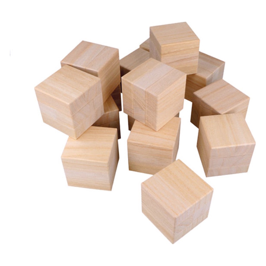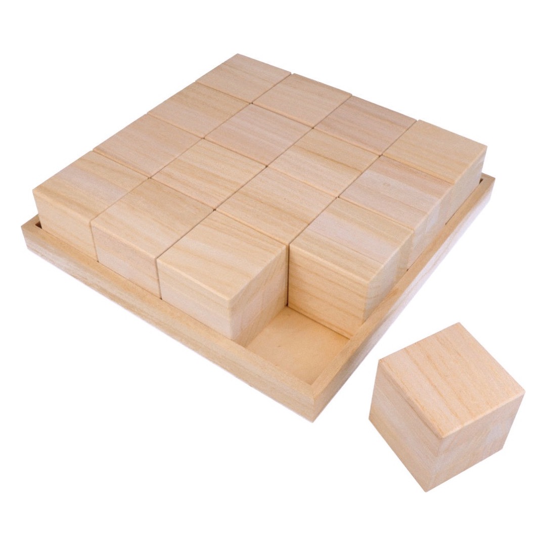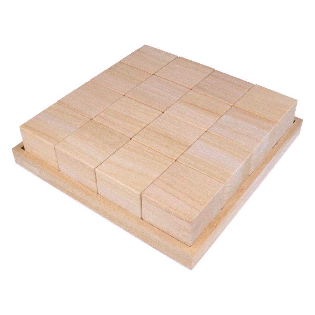 Deze toffe set bestaat uit een houten dienblad van 26,5 x 26,5 x 6,5 cm en 16 houten kubussen van 5×5 cm