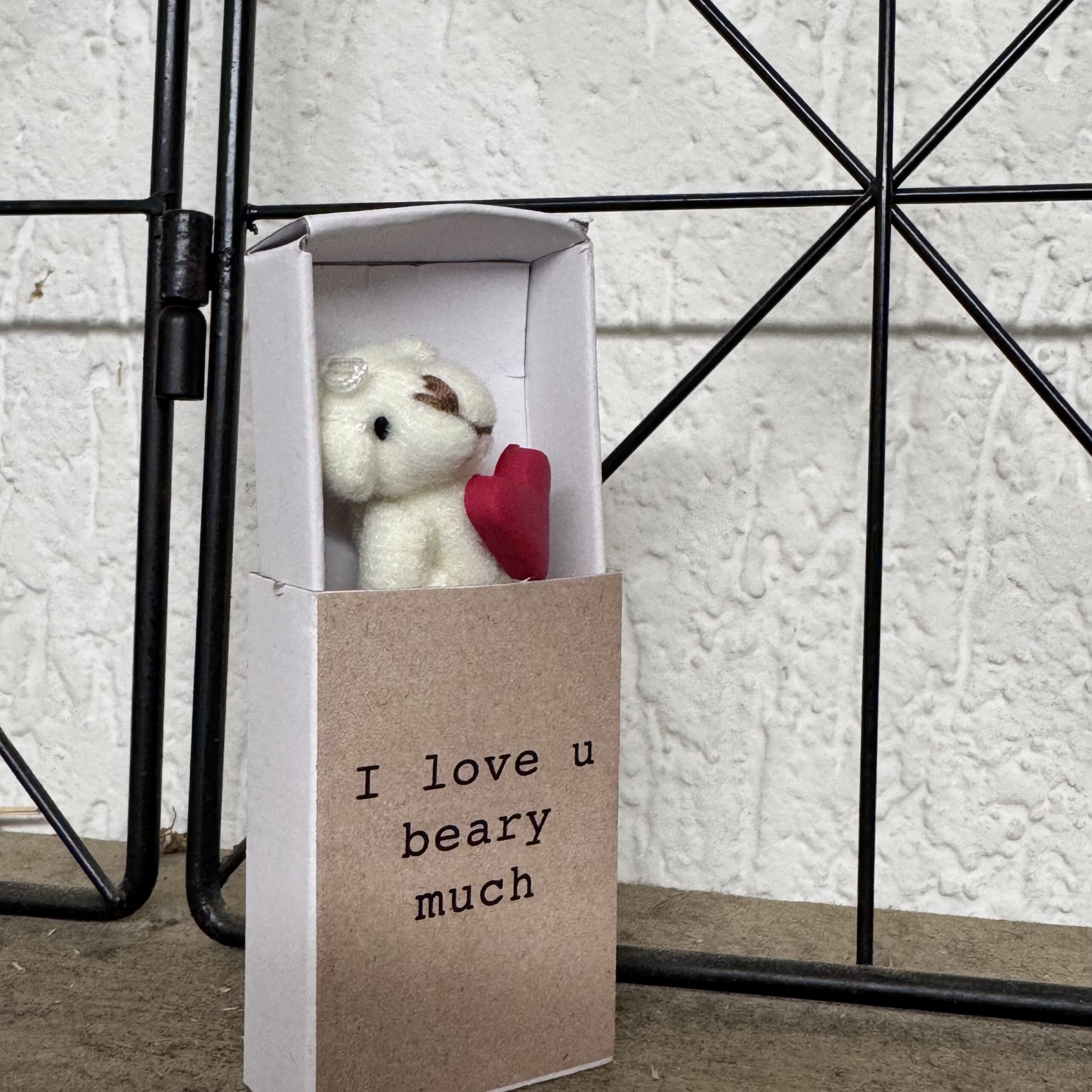 Dit lieve kleine doosje (formaat luciferdoosje) bevat een lief klein wit konijntje met de leuke tekst I love you beary much