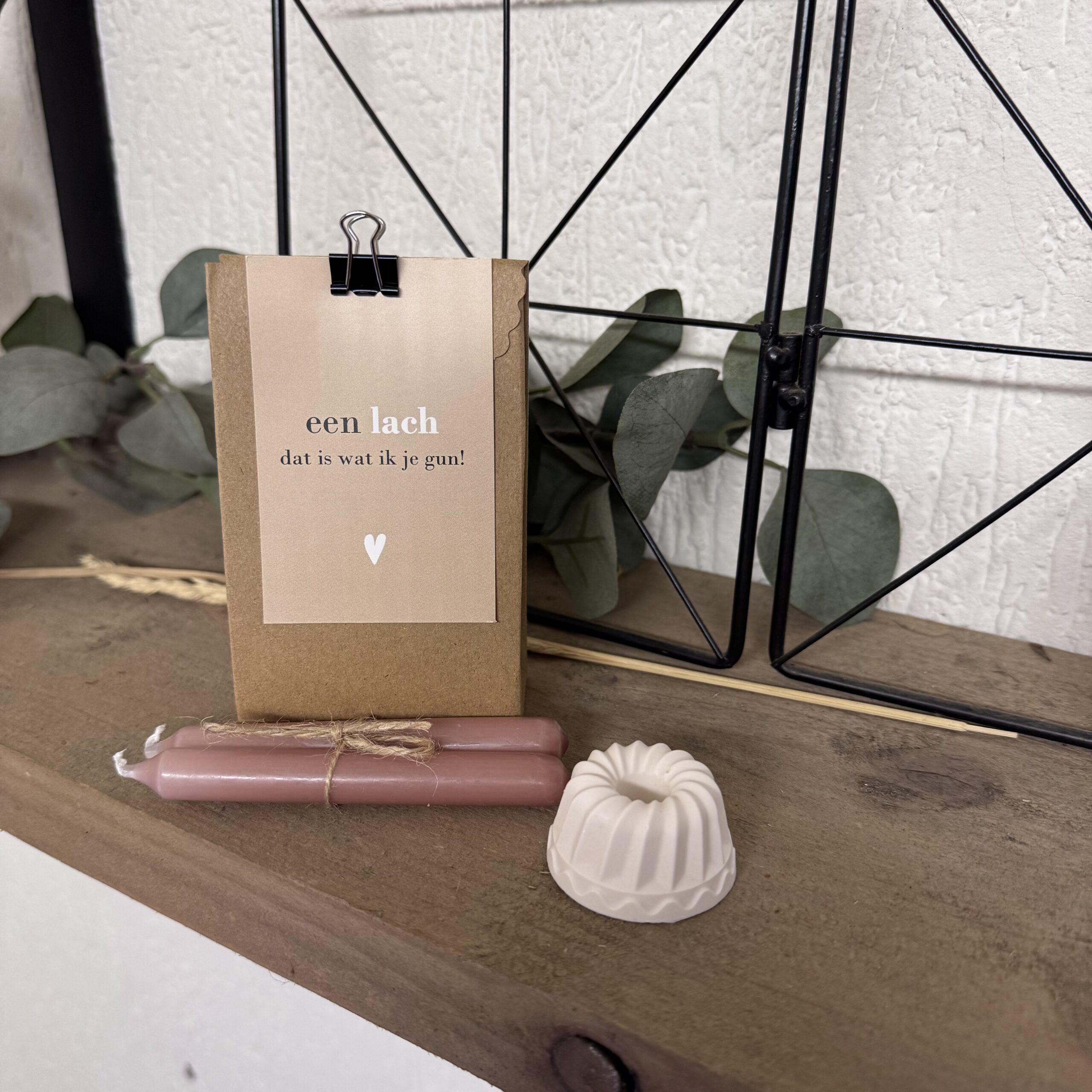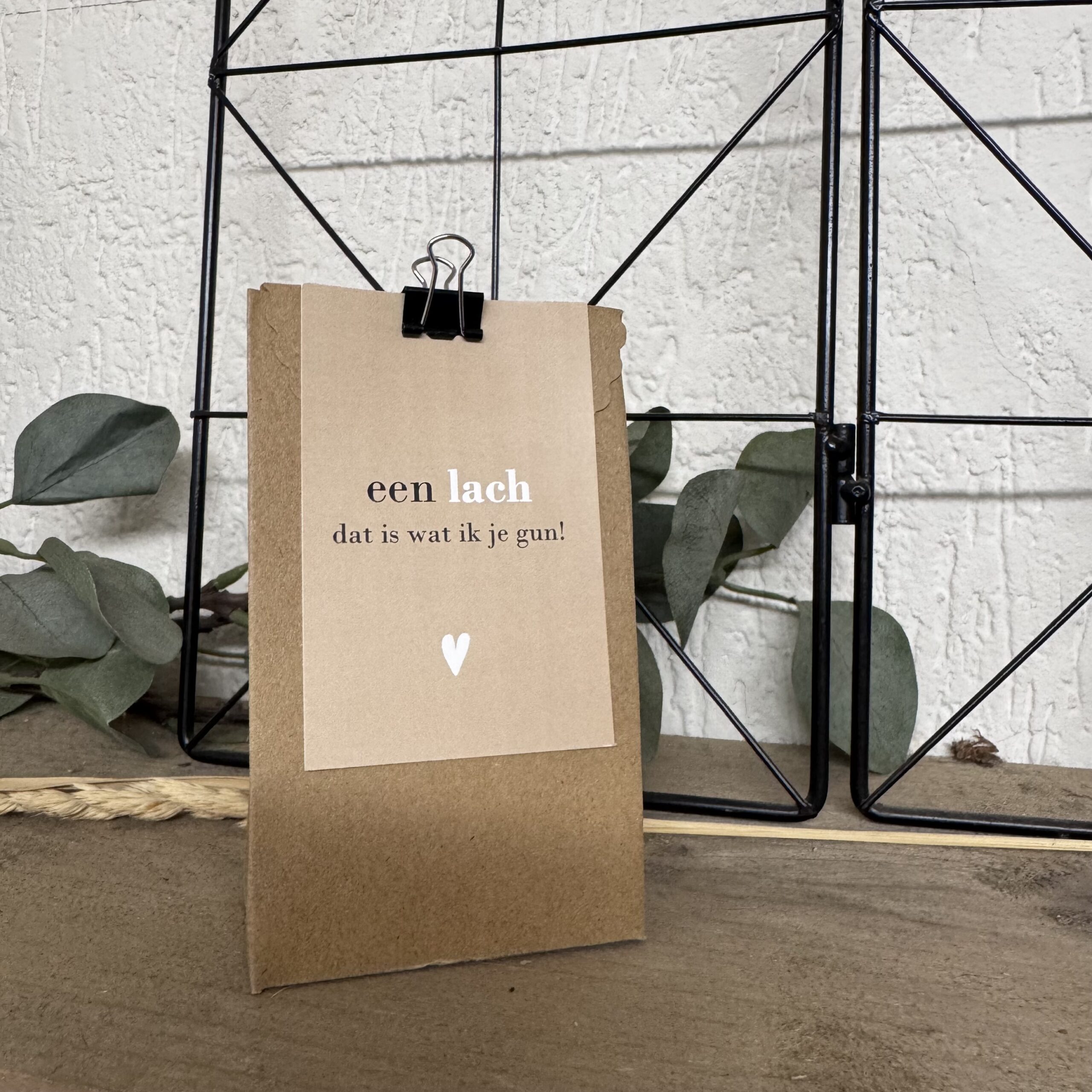 Dit leuke kraftzakje bevat een klein minikaartje met knijpertje met de tekst – Een lach is wat ik je gun.