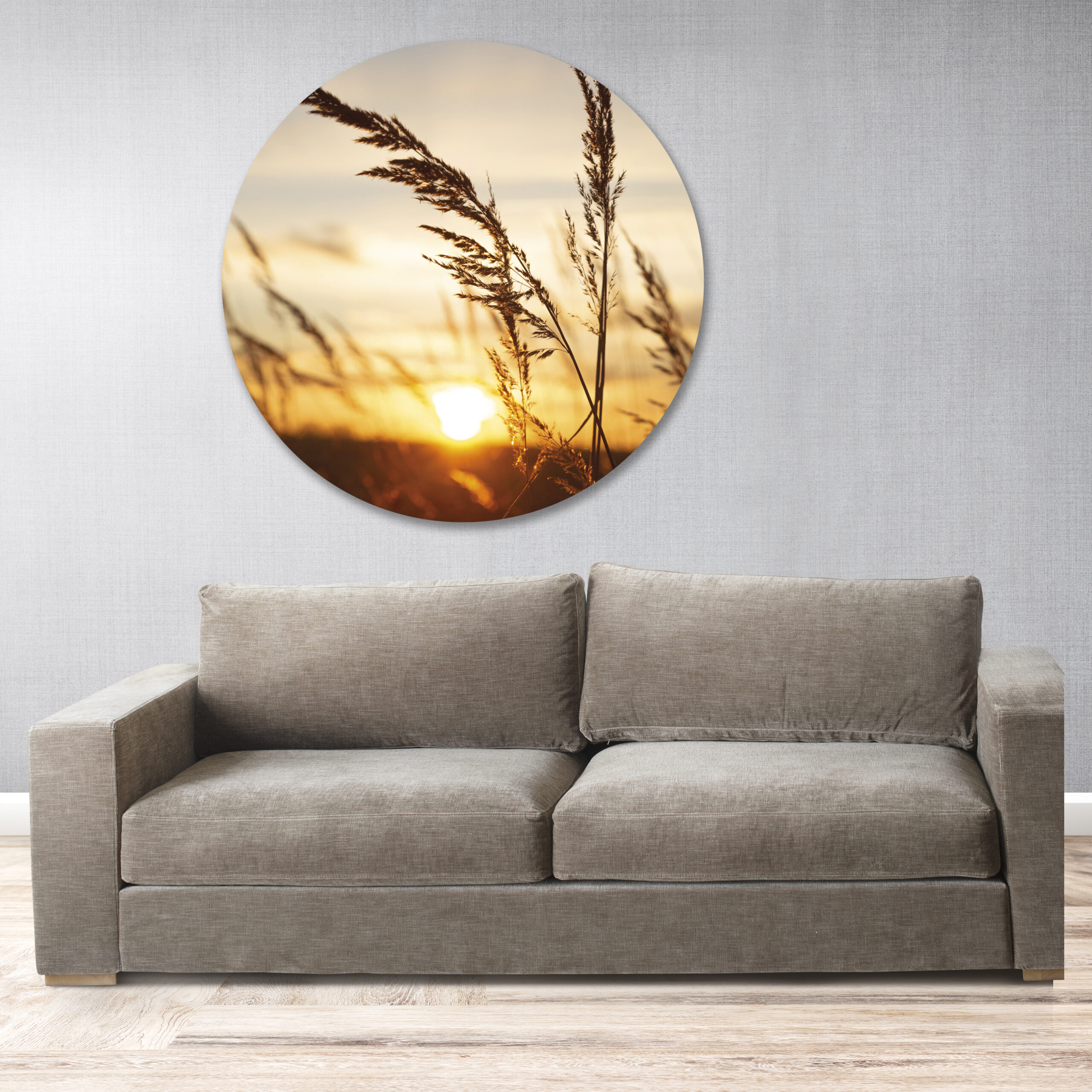 Breng de warme sfeer van een zomerse zonsondergang in huis met deze prachtige ronde wandcirkel Inspiring View. De natuurlijke tinten van het avondlicht gecombineerd met sierlijk wuivend gras zorgen voor een rustgevende en stijlvolle uitstraling in elk interieur. Perfect voor de woonkamer, slaapkamer of kantoor – deze wanddecoratie geeft direct een vleugje natuur en warmte aan jouw muur.